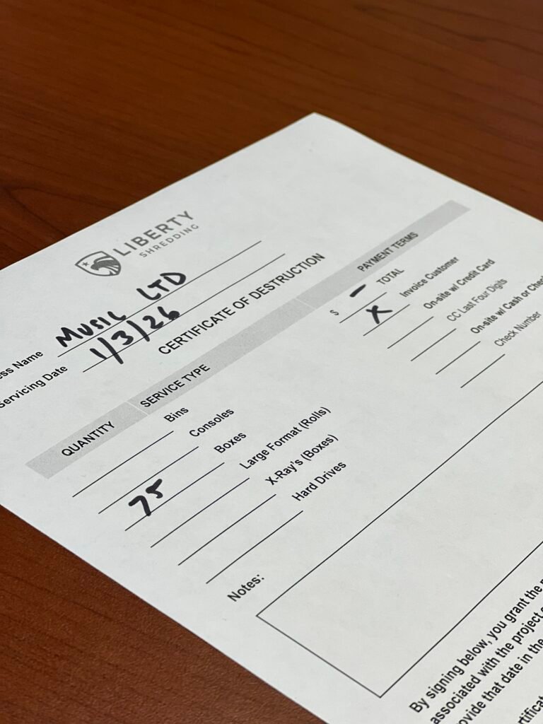 Each shredding service includes a Certificate of Destruction, confirming that materials were destroyed properly. This documentation supports internal procedures and provides assurance that client information was handled responsibly.